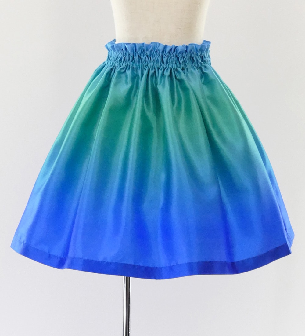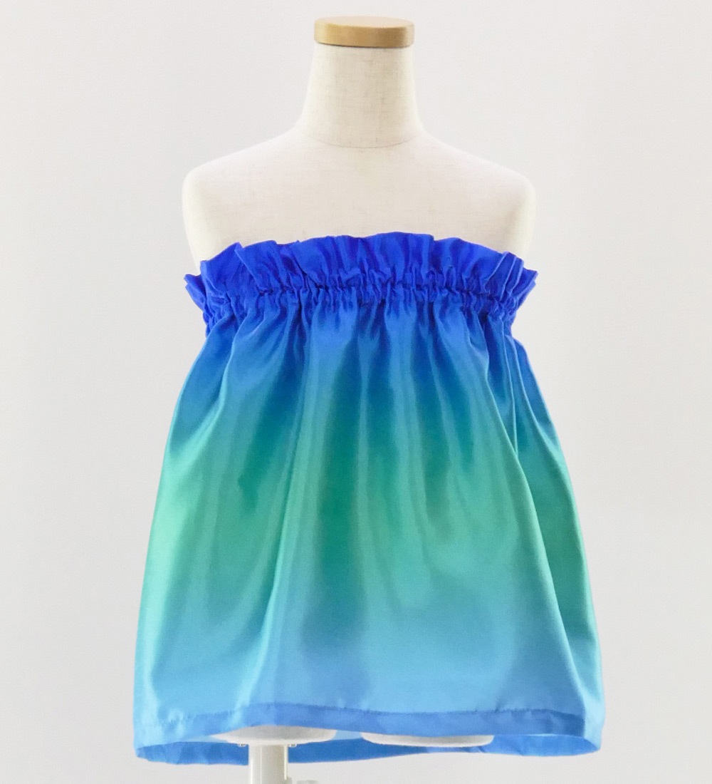 カラフルなグラデーションとキラキラのシャンタン生地でプリンセス感アップ!ドレス風の着こなしはもちろん、パウスカートとしてTシャツなどと合わせるのもおすすめです。胸回り、ウエストのゴムは調整・入替可能で、スカートは丈の長さをお選びいただけます。