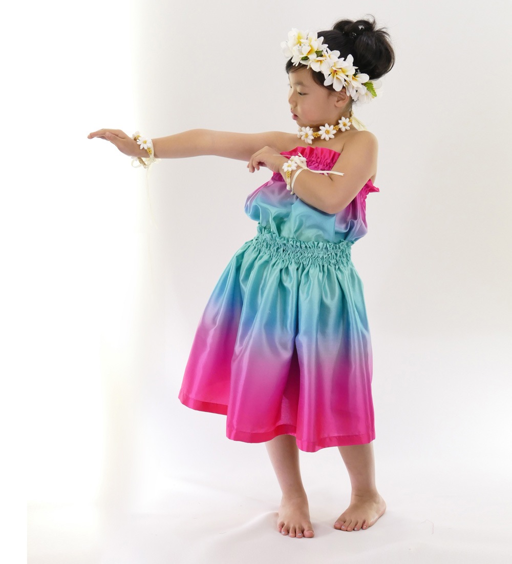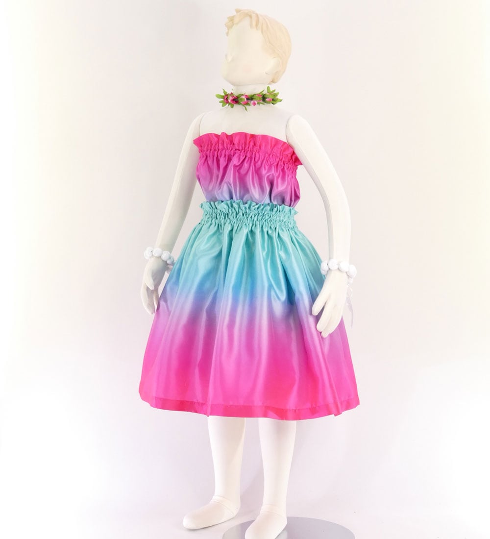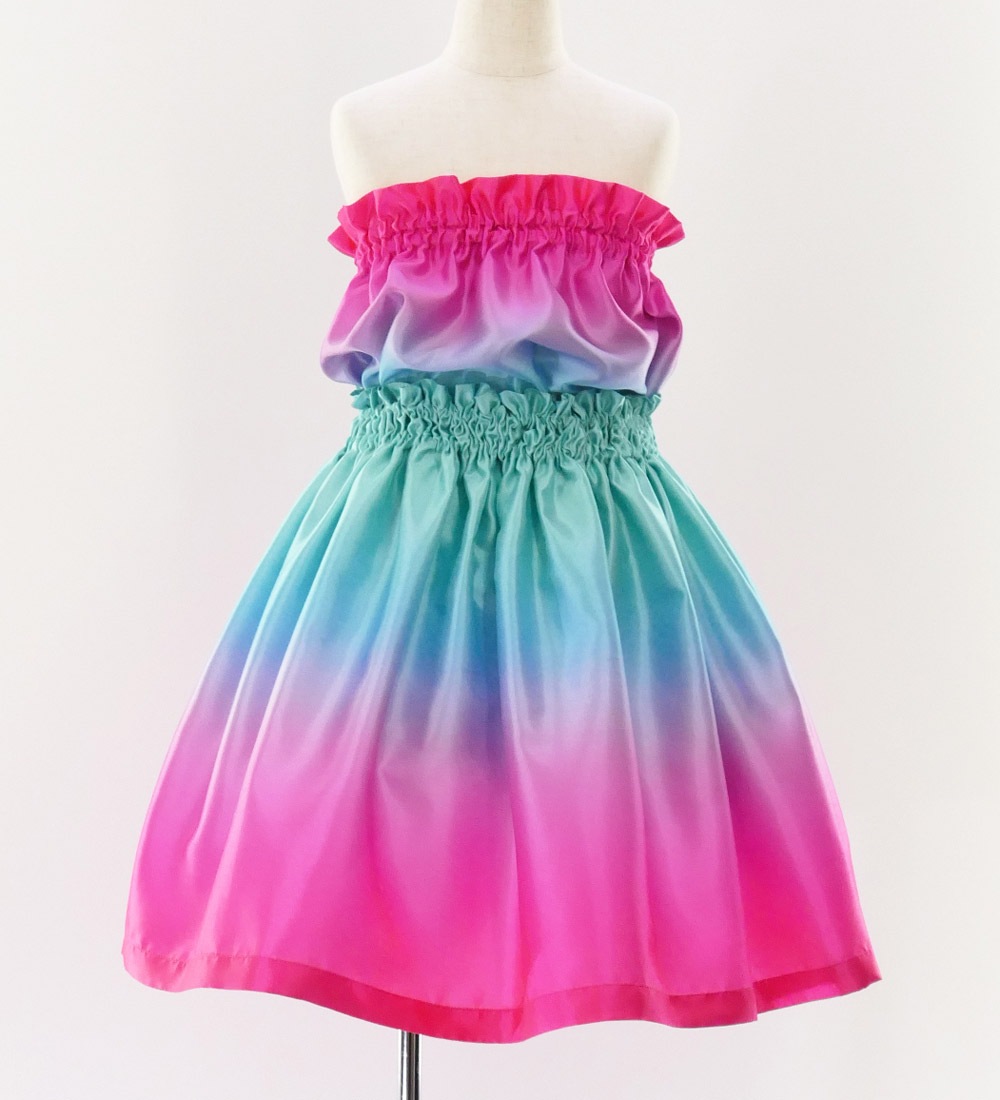 カラフルなグラデーションとキラキラのシャンタン生地でプリンセス感アップ!ドレス風の着こなしはもちろん、パウスカートとしてTシャツなどと合わせるのもおすすめです。胸回り、ウエストのゴムは調整・入替可能で、スカートは丈の長さをお選びいただけます。