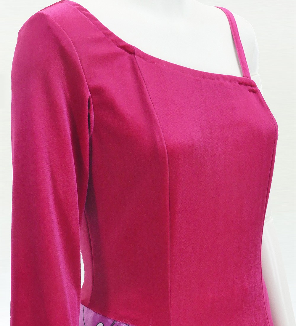 トップス部分は伸縮性・高級感のあるストレッチベロア生地、 スカート部分はシャンタン生地を使用しました。