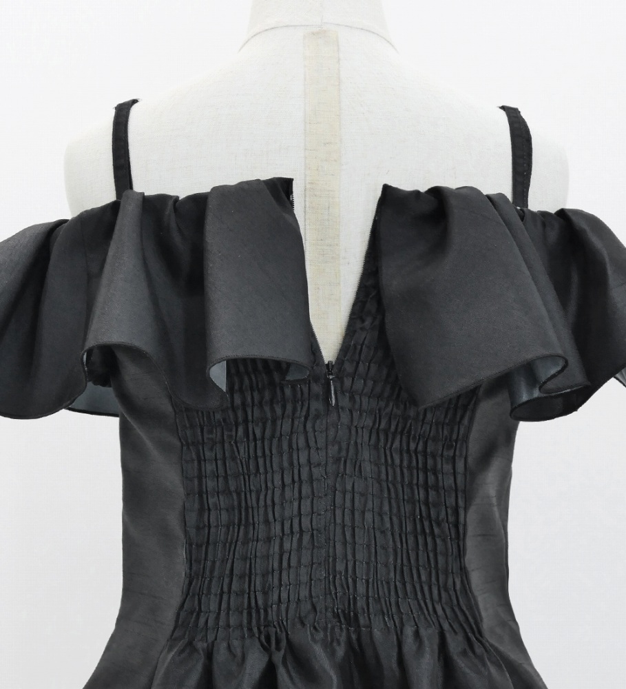 デコルテを美しく見せてくれるオフショルダースタイルのミディ丈フラドレスです。