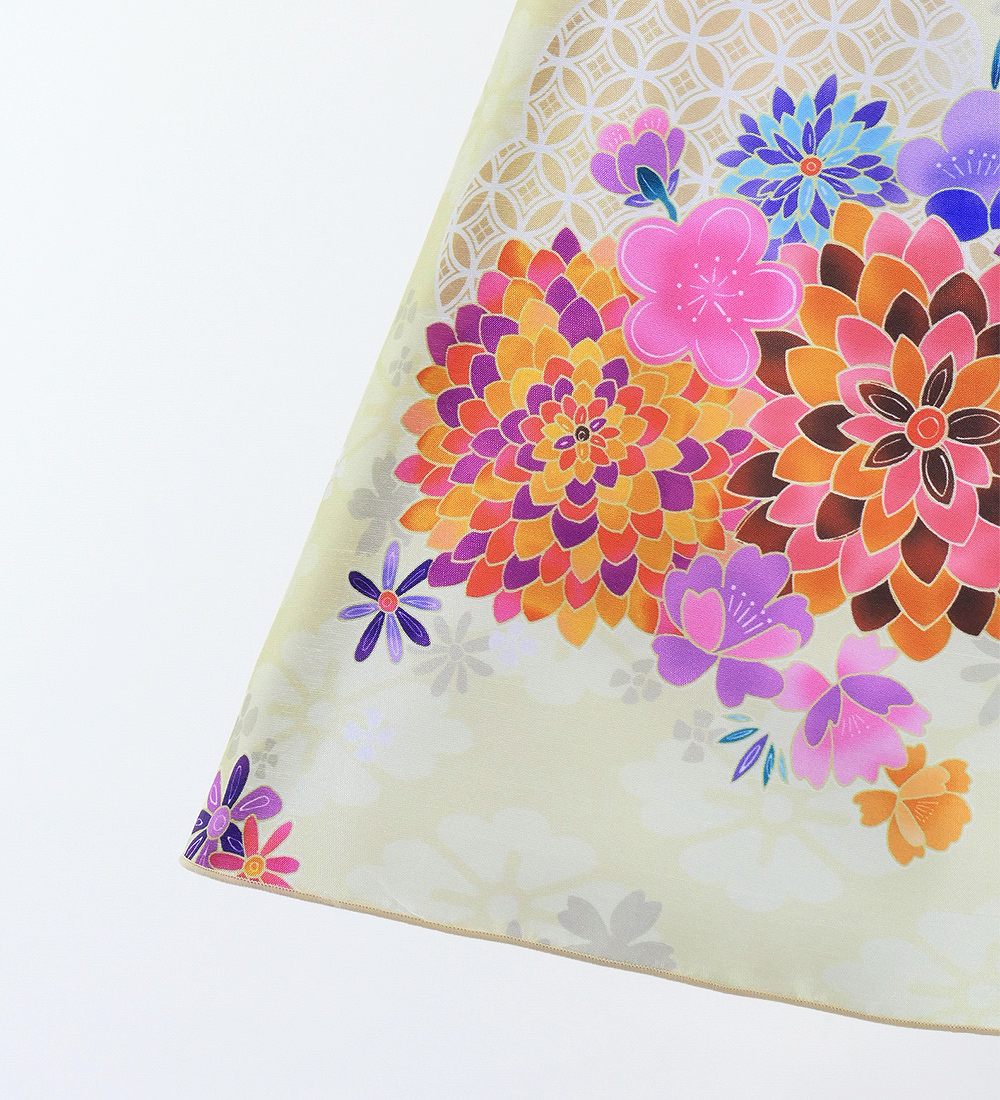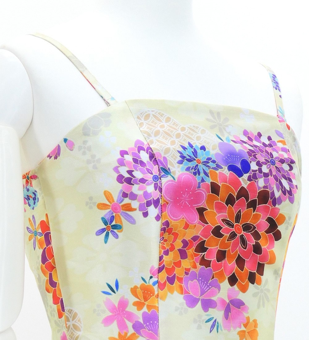 菊、梅、桜をあしらった日本の伝統的な和柄のミディ丈ドレスです。