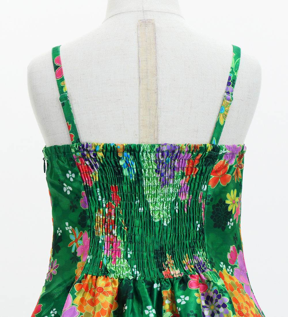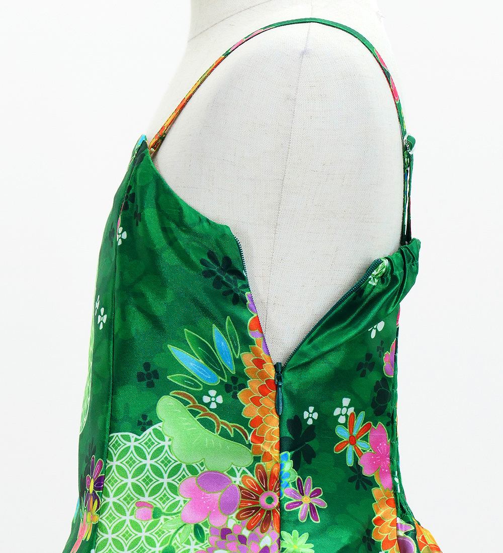 キッズ用の菊、梅、桜をあしらった日本の伝統的な和柄のミディ丈ドレスです。