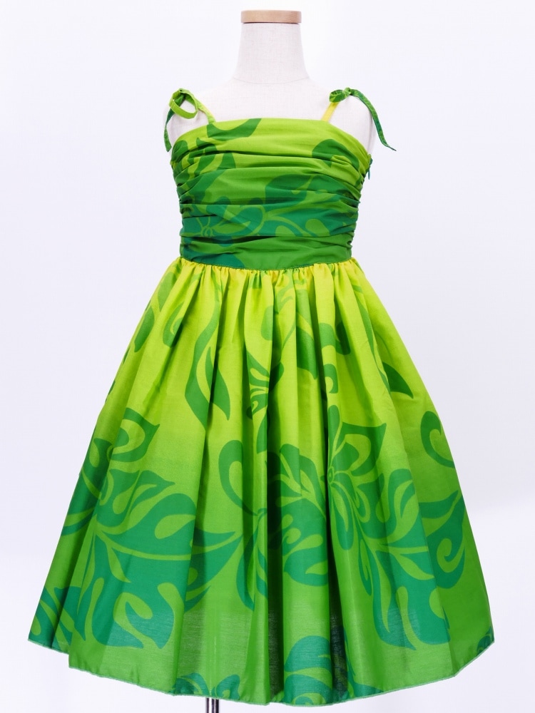 胸元にドレープデザインを施し、グラデーションプリントのハワイアンファブリックを使用したケイキ(キッズ)用のミディ丈ムームードレスです。