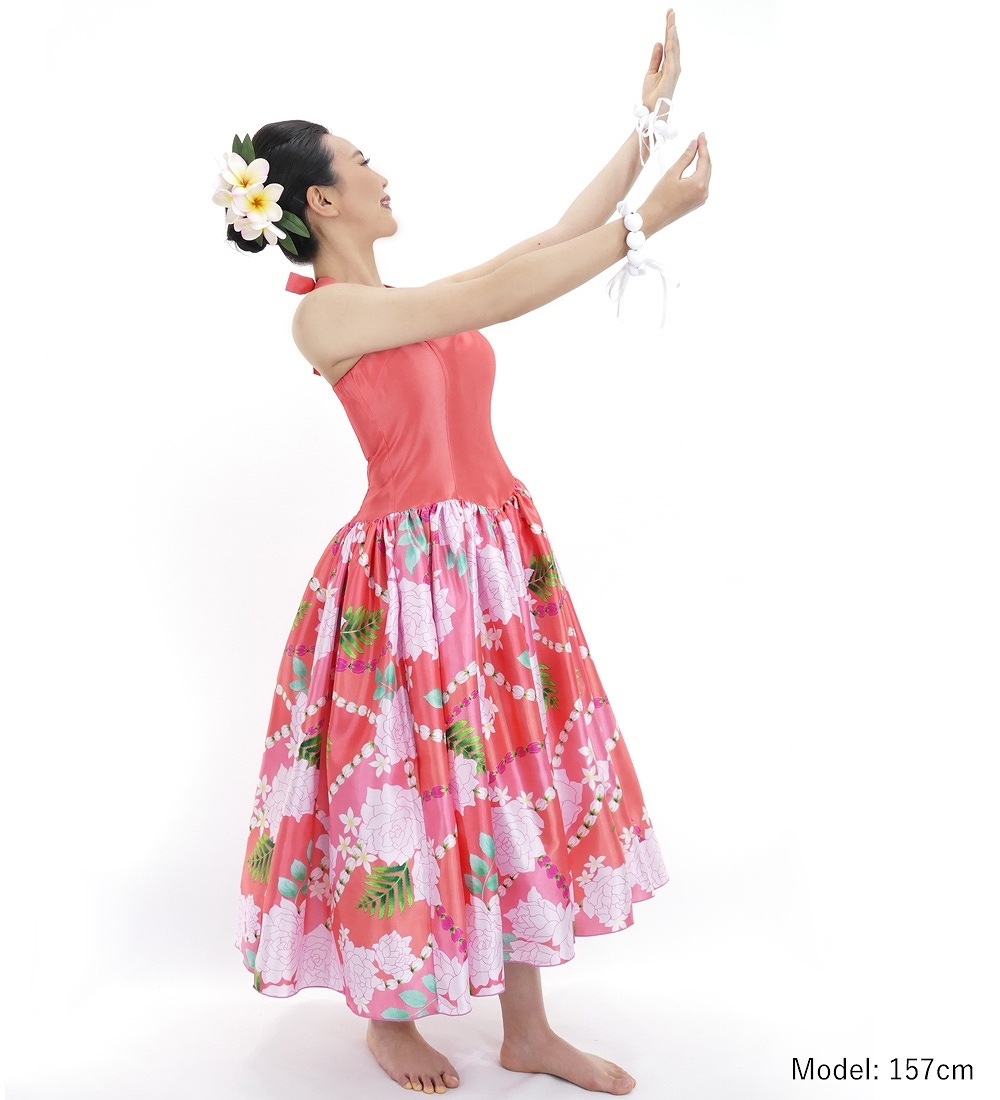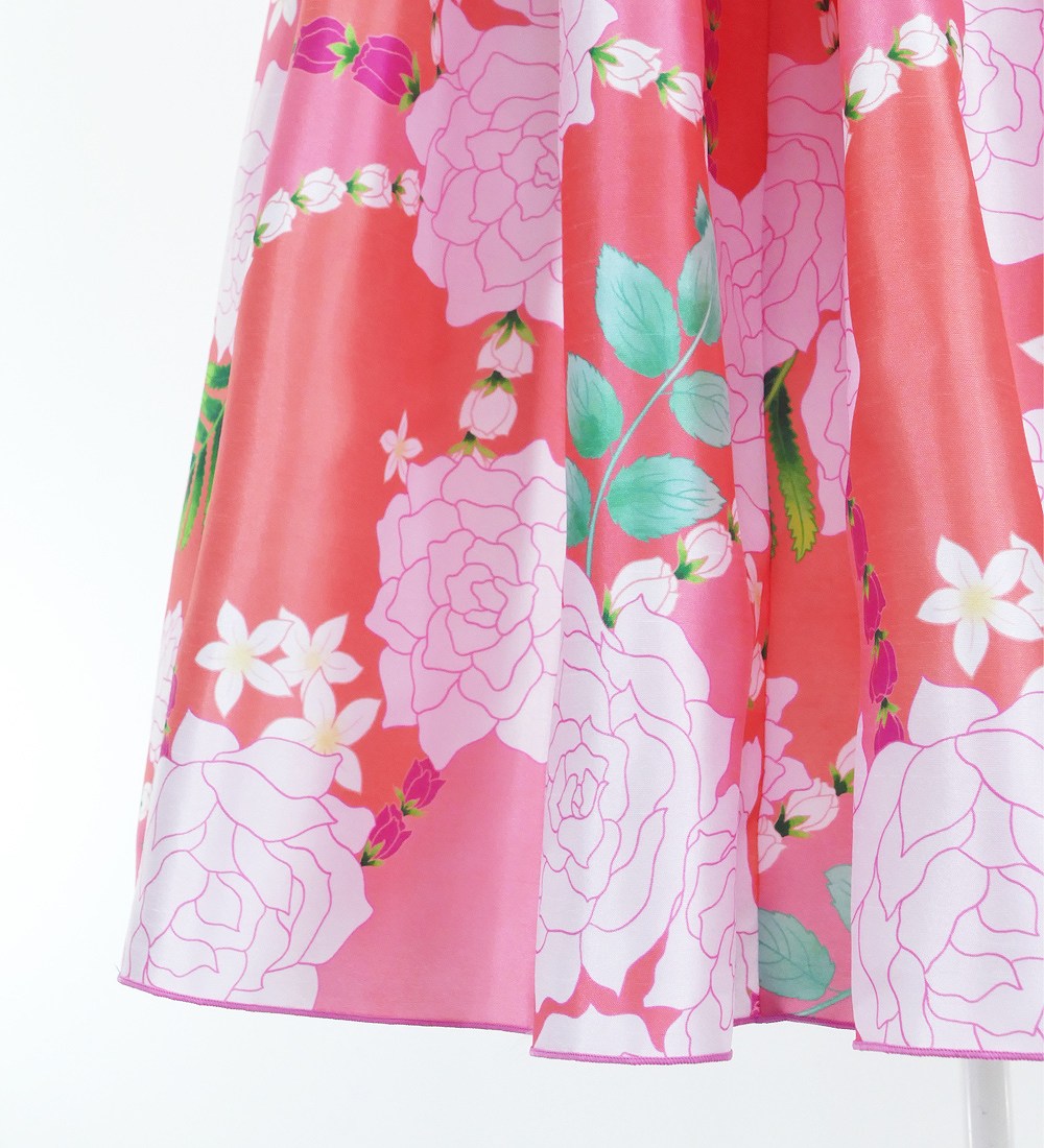 光沢のあるシャンタン生地で、優美なロケラニ柄のミディ丈フラドレスをご用意しました。
