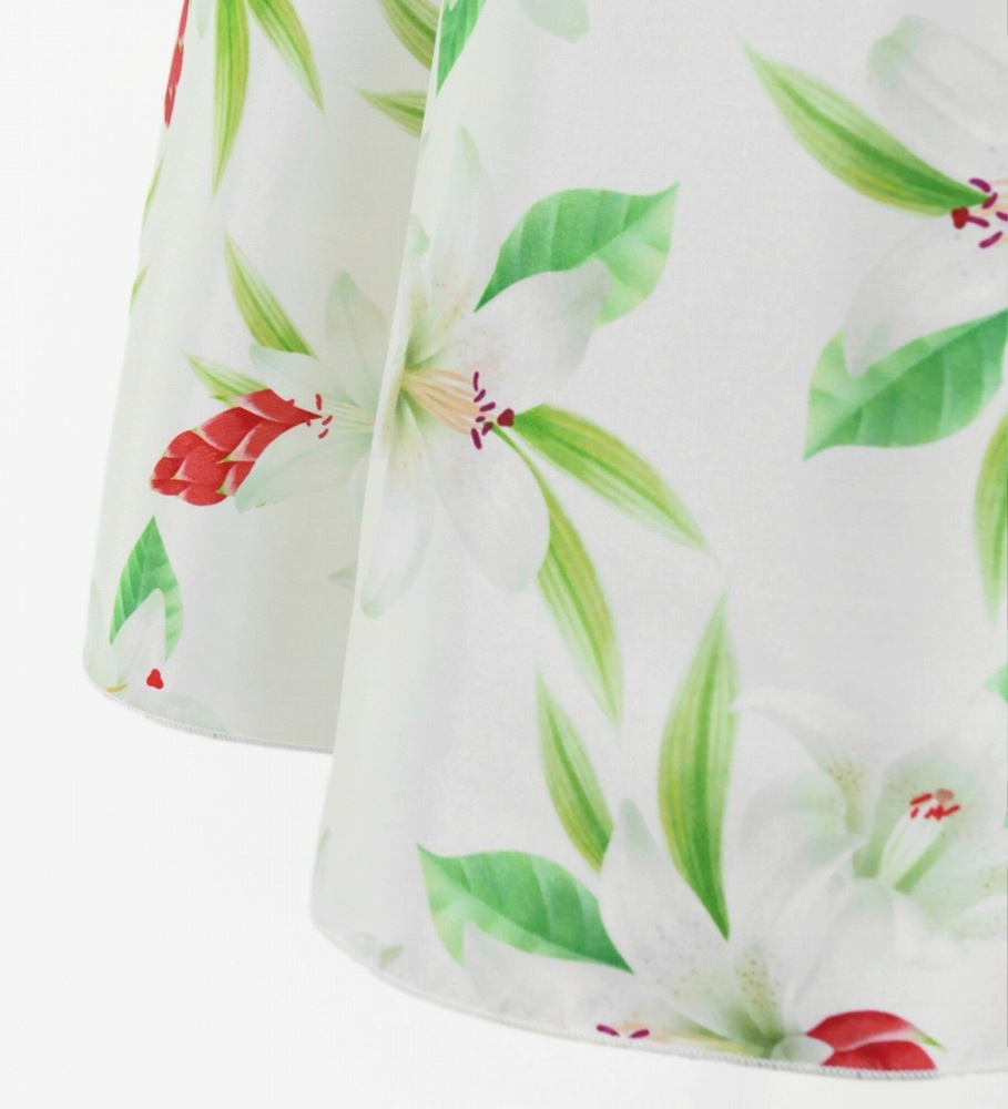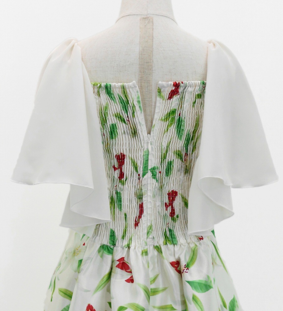 キラリと上品に光るリリー柄のシャンタンドレスに 色を合わせたドレス地模様のコシボ生地スリーブの 2種の生地が重なり合い、素敵に演出してくれます。