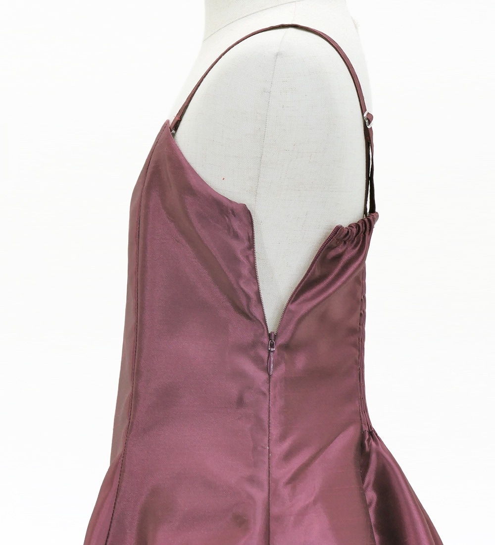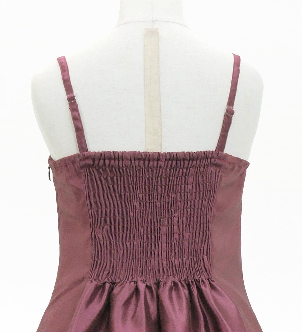 光沢のある上品なシャンタン生地で、ふわりと広がる裾、可憐なシルエットは目を惹くこと間違いなしです。